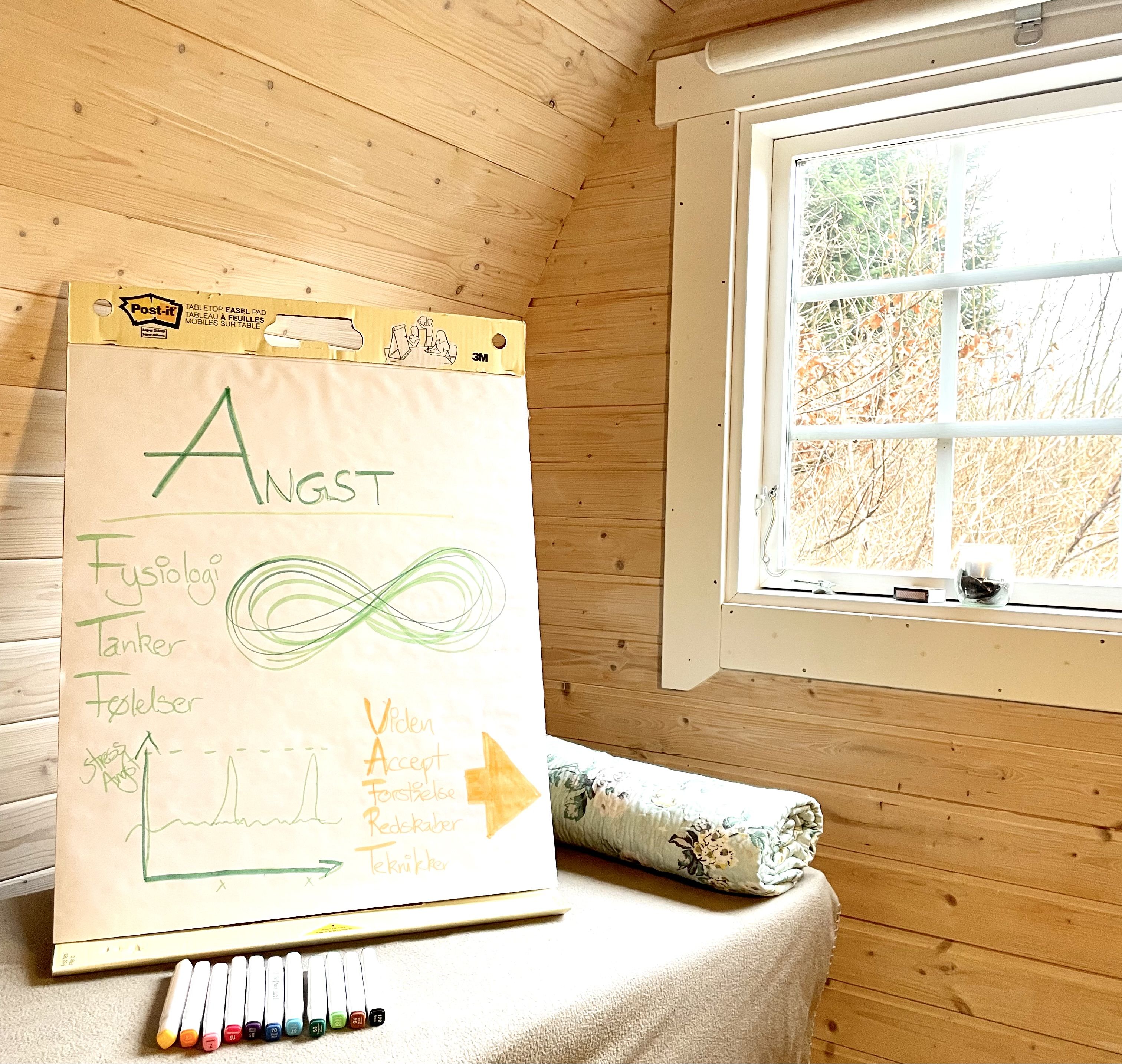 "Tak for et godt forløb i Hytten! Jeg er så taknemmelig for al den viden og de redskaber, jeg har fået. Først og fremmest er jeg glad for at have sluppet af med min angst – det var nemmere, end jeg havde regnet med. Helle er meget omsorgsfuld, vis og lattermild. Det har været rigtig godt at få tingene tegnet undervejs og fantastisk at slutte af med 20 minutters trykmassage. Jeg er altid gået løftet fra sessionerne i Hytten."